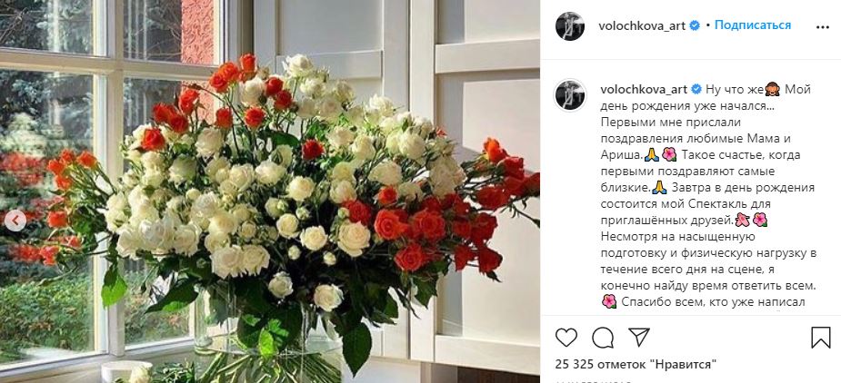 Также Волочкова опубликовала фото первых подарков от родных. Это картина, где изображены представительницы рода – сама Анастасия, ее мама и дочь. Кроме того, Арина и Тамара Владимировна подарили балерине огромный букет белых и красных роз.