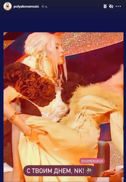 На опубликованном видео Полякова и Каменских поцеловались в губы во время записи шоу "Маска". На другом ролике артистки станцевали страстное танго. Пользователи Сети также присоединились к поздравлению и оставили Насте Каменских массу пожеланий.