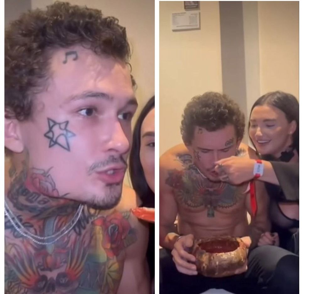Адель Асанти, бывшая актриса фильмов для взрослых из Днепра, и Кристина Кустова, модель из Киева, будучи в полуоголенном виде, покормили из ложечки борщом скандального артиста из РФ.