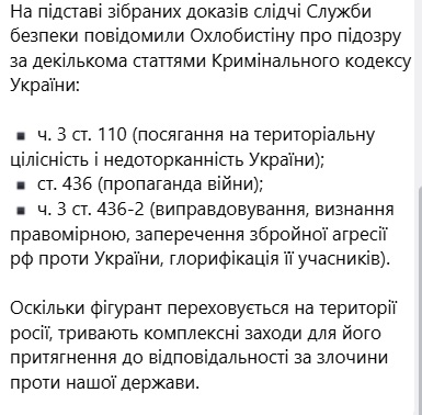 Представители украинских правоохранительных органов подчеркивают, что осенью 2022 года Охлобыстин был одним из хедлайнеров концерта-митинга на Красной площади в Москве и, выступая со сцены, горячо поддержал оккупацию украинских земель, которые режим Путина объявил "присоединенными" к РФ.