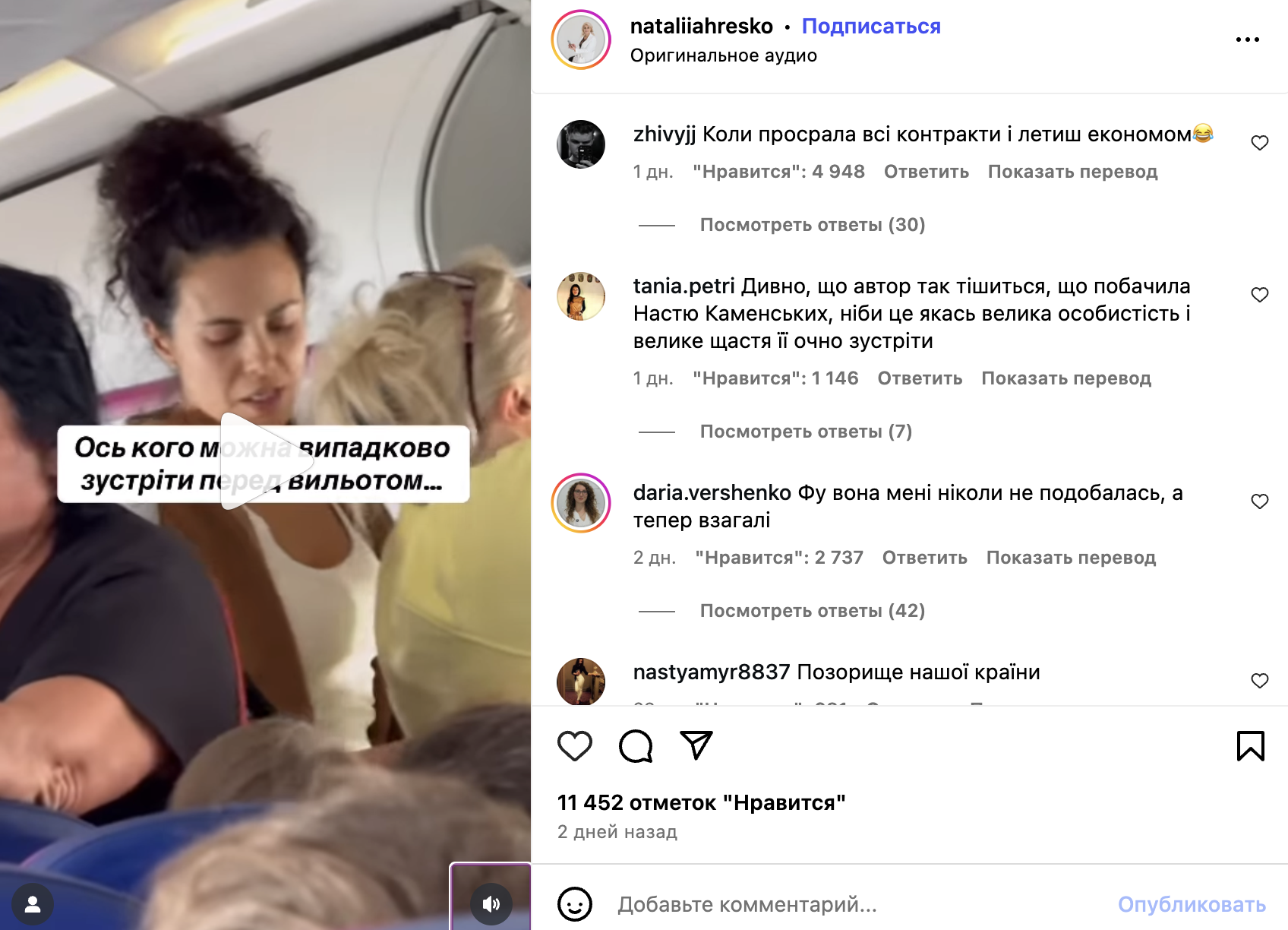 Одна из пассажирок самолета рассказала, что во время посадки столкнулась с Каменских в проходе. По ее словам, певица пыталась пройти к своему месту и расталкивала людей, вызывая раздражение у окружающих. Автор публикации выложила соответствующее видео, но в целом не стала высказывать какой-то негатив к Насте.