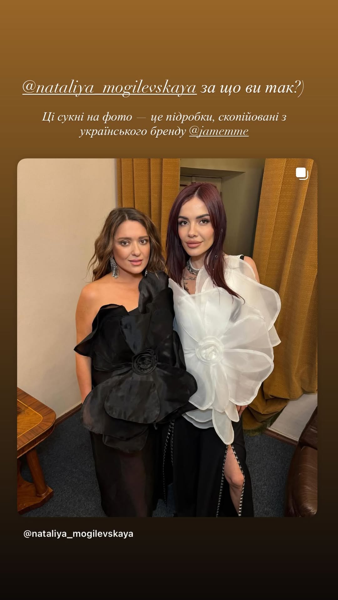 "За что вы так?", – написала Ярмолюк в подписи к фото, отметив, что наряды практически полностью повторяют авторские модели ее бренда. Она также опубликовала еще один кадр, на котором Могилевская снова появляется в похожем платье. "Так и хочется сказать: не опять, а снова", – добавила дизайнер.