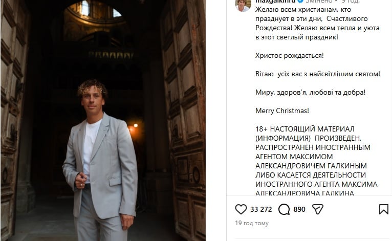 Максим Галкин, известный артист и телеведущий, объявленный иноагентом властями РФ, в Instagram поздравил подписчиков с Рождеством. Помимо традиционного обращения на русском языке, шоумен добавил послание на украинском, который он активно изучает.