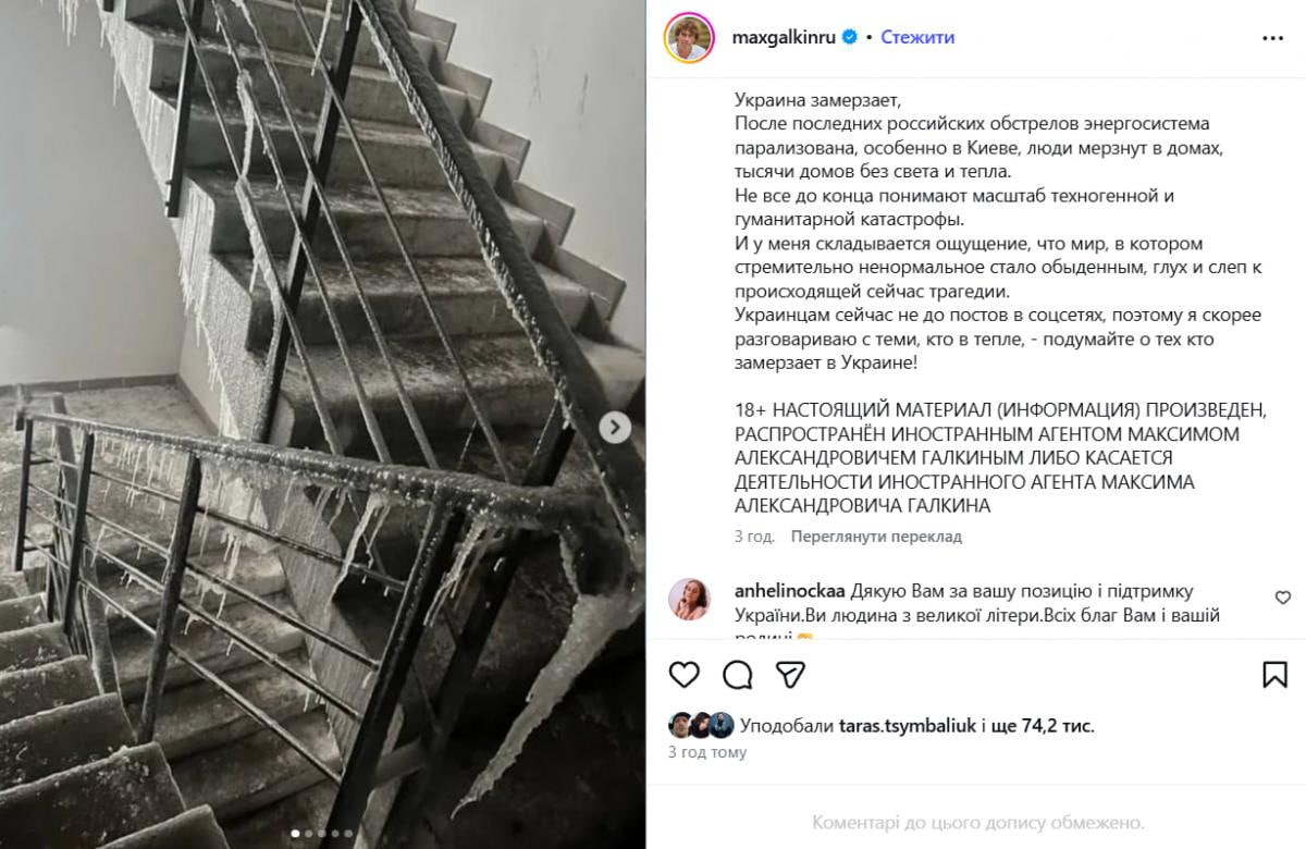 Максим Галкин написал, что после атак российской армии энергосистема, в частности в Киеве, оказалась частично парализована, а тысячи людей остались без света и тепла в мороз. Речь идет не только о технических разрушениях, но и о масштабной гуманитарной катастрофе, отметил артист.